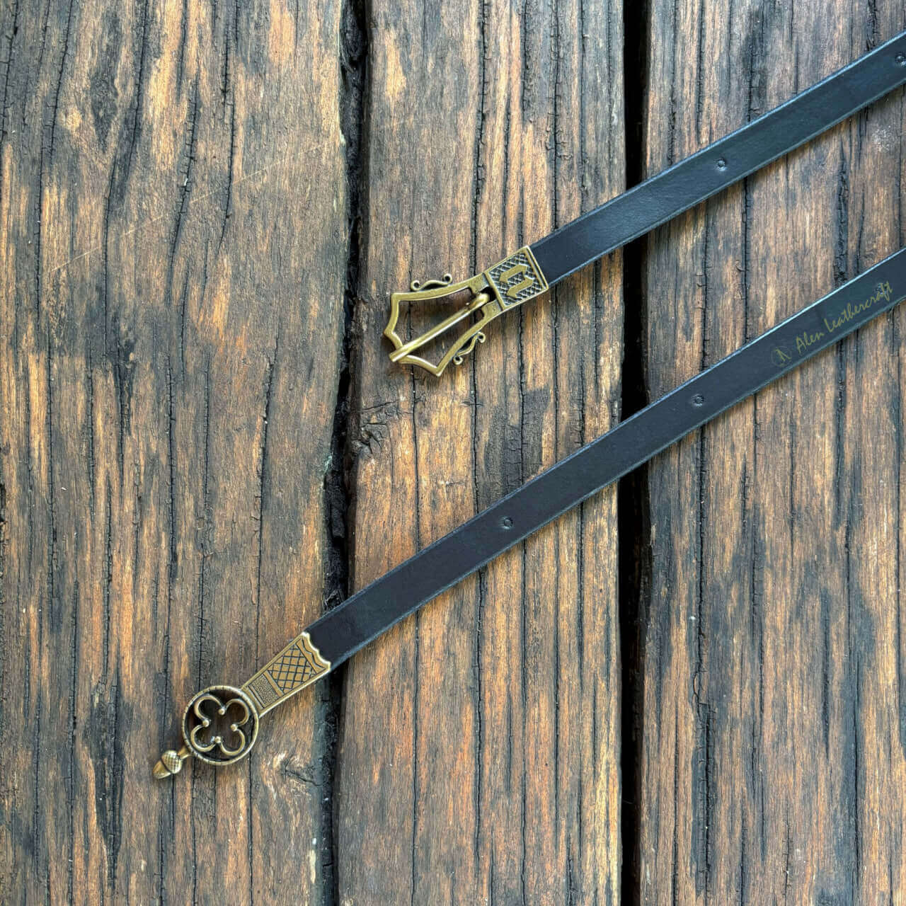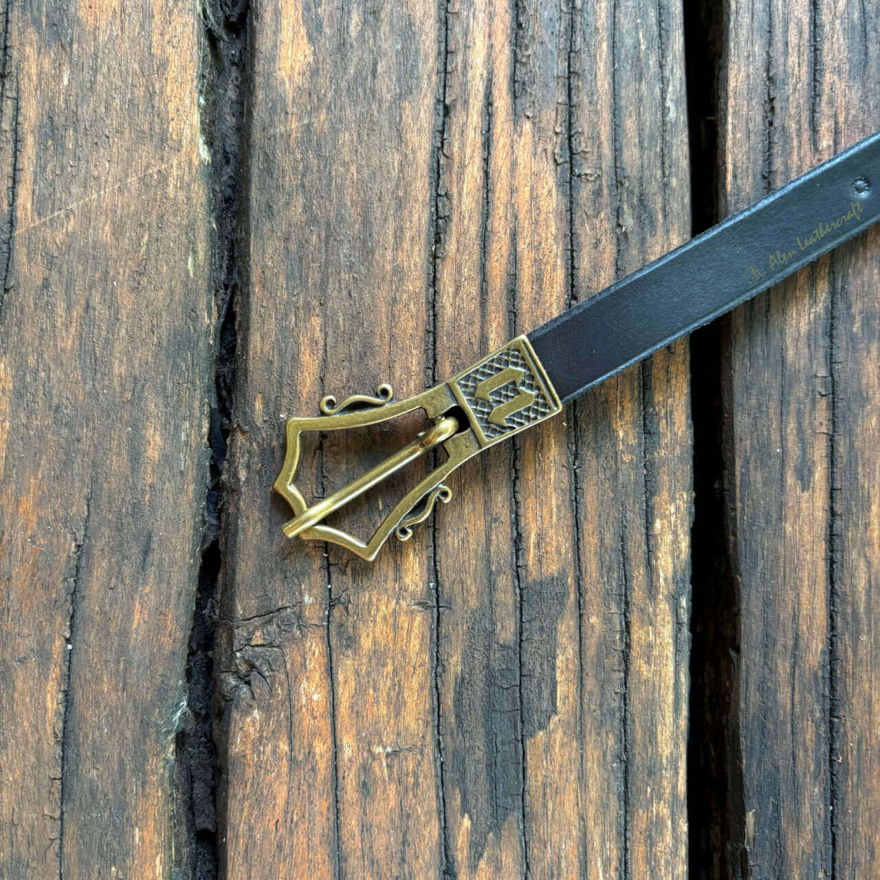 Ta ročno izdelan usnjeni pas je izdelan iz visokokakovostnega vegetabilnega usnja, ki zagotavlja trpežnost in dolgotrajno uporabo. Zaponka in pasni zaključek sta navdihnjena po najdbi iz Anglije iz 14.-15. stol.
