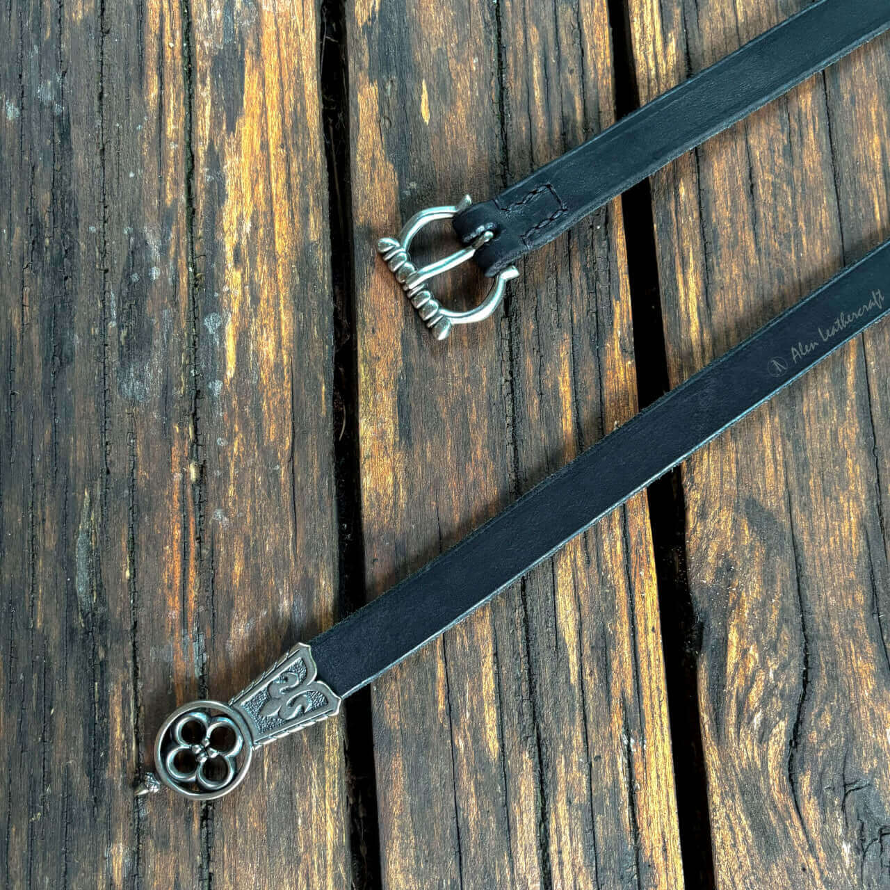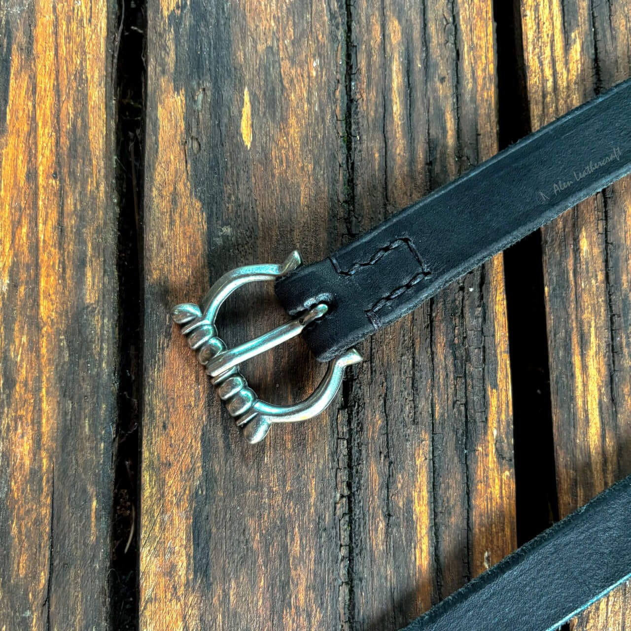 Ta ročno izdelan usnjeni pas je izdelan iz visokokakovostnega vegetabilnega usnja, ki zagotavlja trpežnost in dolgotrajno uporabo. Zaponka in pasni zaključek sta navdihnjena po najdbi iz Anglije iz 14.-15. stol.