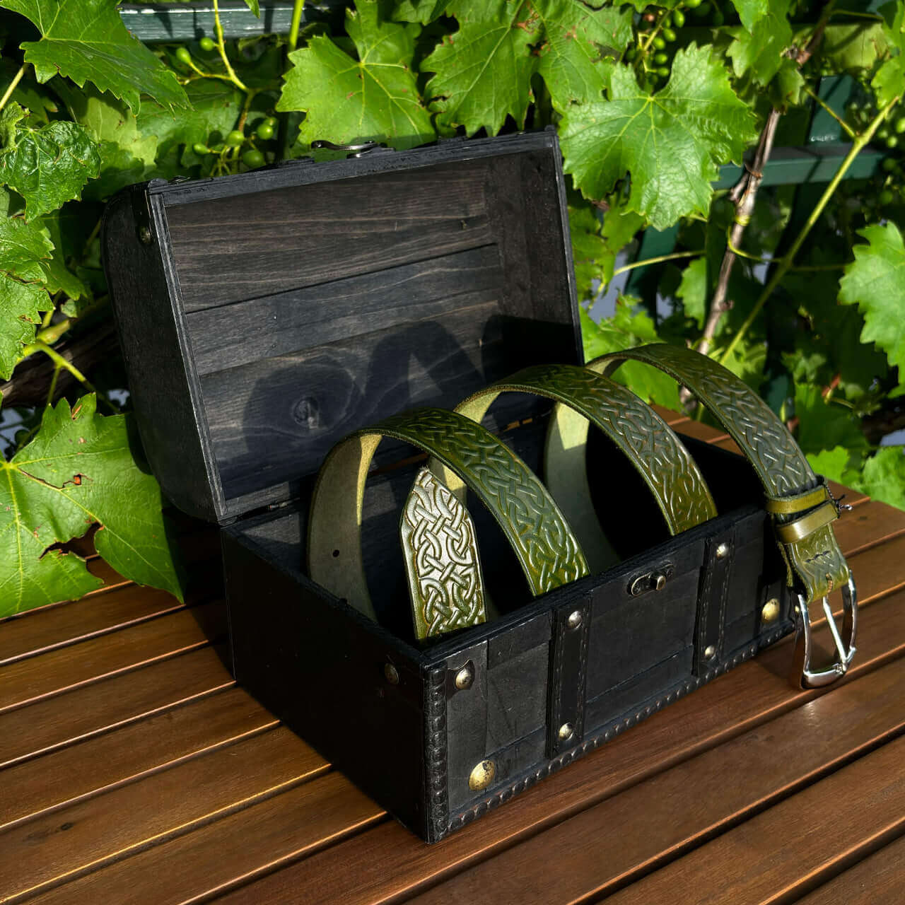 Ta ročno izdelan usnjeni pas karo združuje klasično estetiko z bogato simboliko keltske tradicije v edinstven modni dodatek. Izdelan je iz visokokakovostnega vegetabilnega usnja, ki zagotavlja trpežnost in dolgotrajno uporabo. Površina pasu je obdelana z vzorcem, ki posnema videz lesa, kar mu daje poseben in naraven videz.